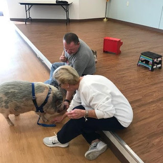 The residents of Ephraim Goldstein Apartments, along with clients from Abramson Adult Day Center, were surprised to see two pigs from Fairy Tail Acres stride into the building on a wintry January 2019. Charlie and Franklin, the two rescue pigs that now reside at Fairy Tail Acres, were delighted to show-off their skills and personality to an enthusiastic audience. In addition to learning about the role of Fairy Tail Acres as a rescue shelter for pigs and other animals, residents were able to see the pigs perform tricks such as playing the piano, sitting, laying down and turning around. Fairy Tail Acres staff answered the residents’ many questions regarding this unique and enjoyable pet therapy.